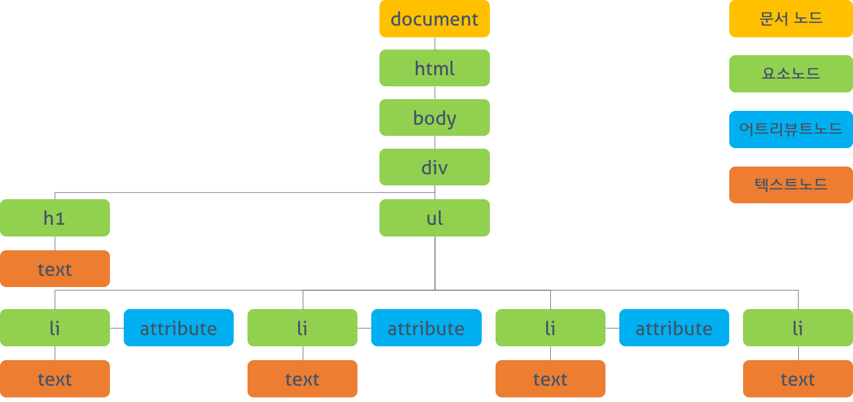 - 요소 노드는 HTML 요소를 표현. 어트리뷰트, 텍스트 노드에 접근하려면 먼저 요소 노드를 찾아 접근해야 한다.